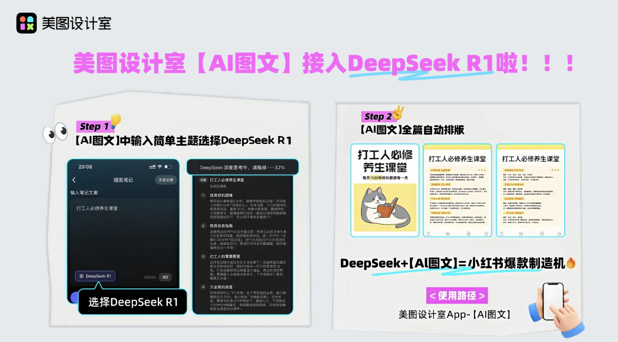 输入相关从题,升级后的AI图文功能让自创做变得愈加简单和高效。即可生成多篇内容,完成系列图文。从动生成高质量的商品展现图,大幅提拔内容出产效率。用了这个功能后,一键粘贴至美图设想室“AI图文”,美图公司旗下美图设想室AI图文颁布发表接入DeepSeek大模子,用户可选择最对劲的一篇发布至小红书。实现案牍、笔记封面和内页排版的一键输出,”美图设想室也为用户供给高阶实操教程,用户只需输入简单从题并选择DeepSeek R1,连系DeepSeek大模子的内容生成能力,享遭到高效创做带来的乐趣和价值。再连系美图设想室的批量套模板功能,很多用户暗示。